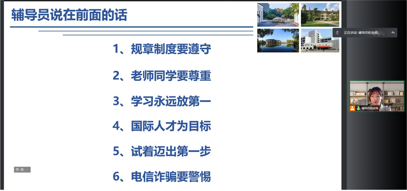 会上,崔书记对新生们的到来表示了热烈的欢迎并主要讲了三点内容。一是鼓励大家抓住当前我国高等教育国际化高质量高水平发展的时代机遇,充分利用各种学习资源和平台,真正做到学以成人,学以成才。二是鞭策同学们正确面对大学期间的压力和挑战,做好拼搏奋斗的准备。三是建议大家认真参加入学教育环节的各项活动,尽快整理思绪,转变角色,适应大学生活。同时,和老师从“辅导员是干什么的”、“你们的辅导员是谁”、“辅导员的办公信息”、“辅导员说在前面的话”四个方面向大家进行了详细介绍。其中,她对新生们提出“规章制度要遵守、老师同学要尊重、学习永远放第一、国际人才为目标、试着迈出第一步、电信诈骗要警惕”六点要求。她还鼓励大家积极学习抗洪抗疫的伟大精神,主动做一些力所能及的志愿服务活动,努力成为具有社会责任感的河海新人。