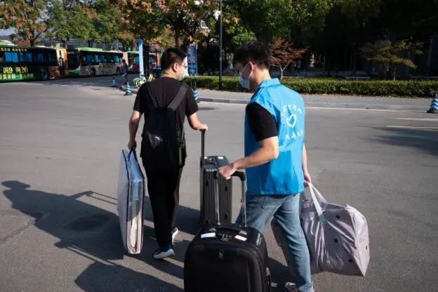 南门迎新点的学院志愿者热情地帮助新同学们搬运行李到接驳车处,待接驳车抵达宿舍楼下后,在下车点等候的学院志愿者便立刻上前帮助大家搬运行李,并且在进宿舍前为他们留下步入河海园后的第一张珍贵合影。