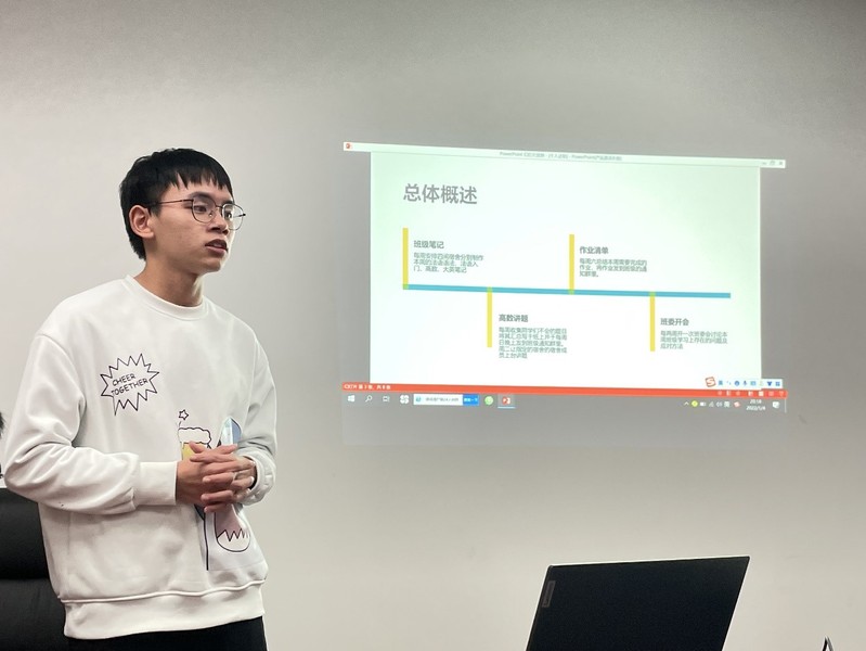 各班团支部书记就基础团务工作、主题团日活动、工作收获与心得三方面依次进行述职。四位团支书均表示目前工作思路不够发散、活动形式不够创新,并提出了下学期的工作计划。