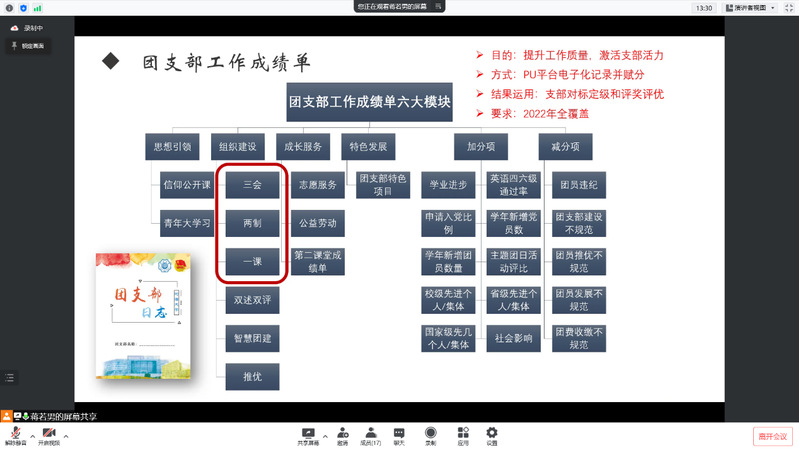 在基础团务工作方面,本学期各团支部需将发展团员、团员“推优”入党、团组织关系转接、团员身份认定、团员教育评议五大任务落到实处。严格落实“三会两制一课”制度,规范完成“智慧团建”系统和“团支部工作成绩单”系统录入工作。