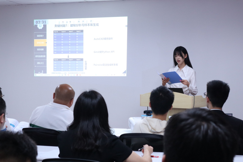 本次答辩会由项目答辩和指导问答两个环节组成。各项目组在五分钟的叙述时间中,就研究内容、项目已有基础、创新点与特色、技术路线等方面进行答辩展示。每组叙述完成后,评委老师根据项目设想、技术可行性、实际准备等方面进行指导提问。