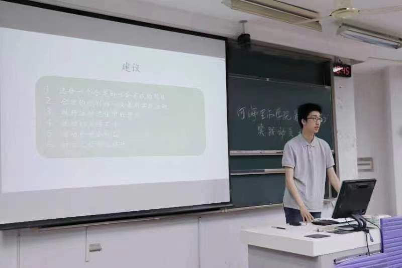 学院2020级周子晗同学分享了“2021年西溪湿地水生态调查实践团”的暑期实践经验。他向大家展示了去年团队社会实践的全过程及亮点工作,并对同学们提出了几点建议,他希望同学们选题好、规划好、宣传好、锻炼好。