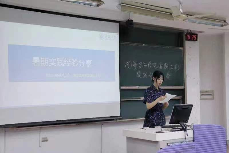 其次,学院2020级蒋若男同学分享了“2021年皖苏红色基地三点一线实地考察实践团”的暑期实践经验。她从见世面、察国情、干实事三个方面向大家阐述了暑期实践的意义,并从调查问卷、实地考察、实践认知等方面向同学们提出建议。