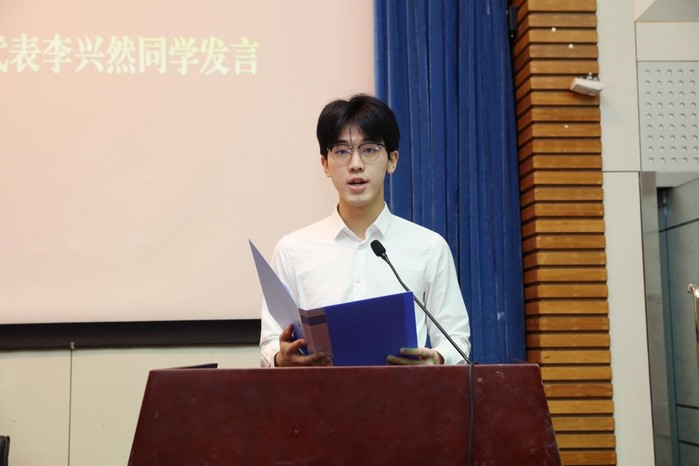 高年级学生代表李兴然同学发言,他从学长的角度与大家分享了自己的学习和生活感悟,他认为在大学这一角色转型的关键期,学生应从“积极乐观、永葆活力”“守正笃实、久久为功”“懂得取舍、有舍有得”三个方面积极塑造全新的自我,牢记使命,不懈奋斗。