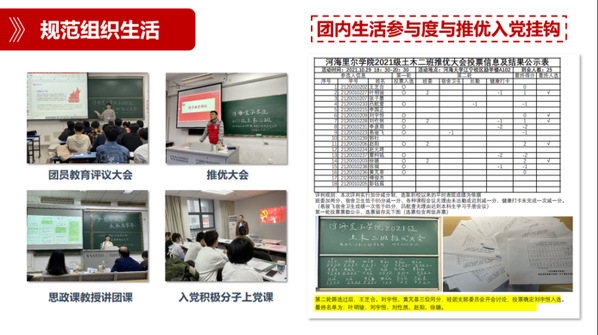 思想是行动的先导,班级着力加强思想引领。首先,严格落实“三会两制一课”制度,做好团内组织生活过程记录,并与推优入党挂钩。班级青年大学习参学率始终100%,入党申请书100%提交,班级发展对象占年级发展对象人数66.7%。其次,注重活动的仪式感及有趣性,跨学科交流会上的横幅签名,党史学习会上的诗朗诵,团员教育评议大会上《我是五月的花海》的大合唱,雨花台革命基地参观时的红袖章、重温入团誓词等都在无形中严肃团内生活,增强活动趣味,2021年,支部获评校级“我的大学100天”优秀主题团日活动。