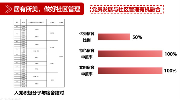 宿舍是同学们的第二个“家”,为营造良好的宿舍氛围,通过将入党积极分子与宿舍一对多结对,把党员发展与社区管理有机融合,班级文明宿舍及特色宿舍申报率100%4间宿舍获评文明宿舍,1间宿舍获评特色宿舍,比例高达50%