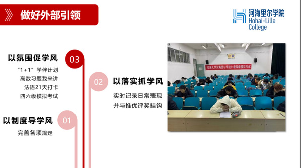 学习是学生的第一要务,班级通过内外兼修,抓好学风创建。首先是激发内在动力:每学期定期召开学风主题班会,使同学们直面差距,增强学习紧迫感;开展学科竞赛交流会、专利分享会及参观实验室,让大家了解专业,以赛促学,7人荣获学科竞赛省级荣誉、2人参与1项国家级大创项目、3人发表实用新型专利4项;带领大家走进校内大型招聘会,了解就业市场,倒逼自身发展,并在每个假期开展“简历中的成长”活动,引导大家总结以往收获,做好生涯规划。其次是做好外部引领:完善各项规定,以制度导学风;将日常表现与推优评奖挂钩,以落实抓学风;开展“1+1”学伴计划、 高数习题我来讲、法语21天打卡、四六级模拟考试等活动以氛围促学风。班级各项成绩均为年级第一。