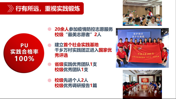 疫情防控期间,班级定期发布志愿服务清单,班级20余人参与疫情防控志愿服务,2位同学获评校园疫情防控“最美志愿者”。同时,寒暑假期间,全员参与社会实践,PU实践学时合格率100%,工地实习、环保科普、乡村支教、追寻五老足迹等,实践形式多样。班级成员建立学院第一个社会实践基地,班级获评省级社会实践优秀团队1支、校级优秀团队1支、先进个人2人、优秀调研报告1篇,同时,班级成员所在“千乡万村”实践团目前进入国家级优秀评选。此外,班级着力构建全面发展型集体,班内近20人为校院两级主要学生骨干。