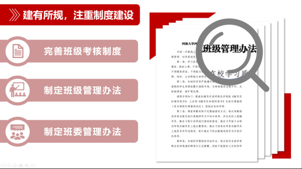 建章立制是班级管理的基础。第一学期结束,针对班级存在的问题,完善课堂考勤、线上上课、健康打卡等制度,制定表格,实时记录大家日常表现,并与推优评奖挂钩,目前班级0违纪。同时,对标“优良学风班”评选考核方案,全员商议制定班级管理办法,规范同学行为。最后,制定班委管理办法,定期召开班委会,目前累计召开二十余次。