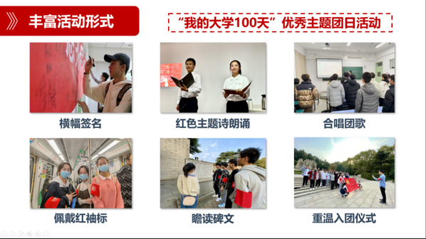 思想是行动的先导,班级着力加强思想引领。首先,严格落实“三会两制一课”制度,做好团内组织生活过程记录,并与推优入党挂钩。班级青年大学习参学率始终100%,入党申请书100%提交,班级发展对象占年级发展对象人数66.7%。其次,注重活动的仪式感及有趣性,跨学科交流会上的横幅签名,党史学习会上的诗朗诵,团员教育评议大会上《我是五月的花海》的大合唱,雨花台革命基地参观时的红袖章、重温入团誓词等都在无形中严肃团内生活,增强活动趣味,2021年,支部获评校级“我的大学100天”优秀主题团日活动。