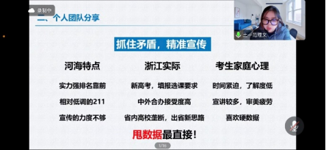 随后,范理文同学和娄阁同学向大家分享了“源泉工程”实践经验。范理文同学提到,宣讲时间需要认真选择,宣讲内容也要结合当地情况决定,针对学校已有材料的特点,站在考生角度换位思考,突出河海特色。娄阁同学表示,前期的准备十分重要,宣讲内容除了介绍学校分数、专业等基本情况外,还要结合我校校史、文化等软实力。