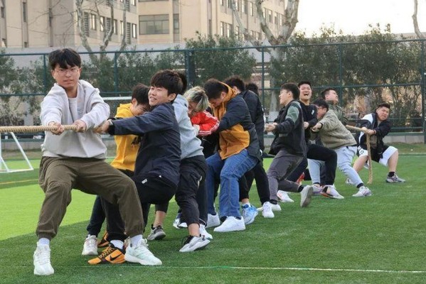 拔河拼的是团结协作,拔的是目标一致。一二三,开始!,当号令发出,各班男子汉们紧握长绳,铆足干劲,使劲后倾拉拽,赛场上的口号声、赛场下的加油声此起彼伏,活动现场高潮迭起,精彩连连。