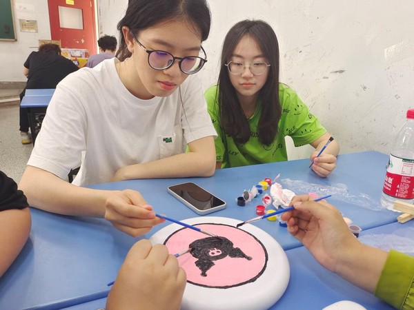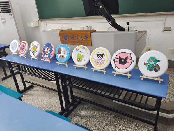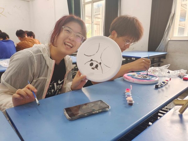 取上颜料和飞盘,各小组在教室内进行飞盘绘制,大家充分发挥创造力与想象力,将日常爱好、生活态度、未来憧憬等融入其中,蕴意丰富,活动现场笑声一片。