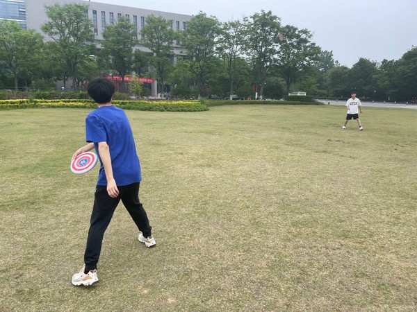 带着成品,各小组来到图书馆草坪前,开始了初次飞盘体验。在活动负责人对飞盘游戏进行讲解后,各小组开始了游戏比拼,分别进行了抛接竞赛、目标圈投掷、接力计时任务小组对抗赛。大家在投掷和奔跑中享受肆意的快感、释放许久的压力。