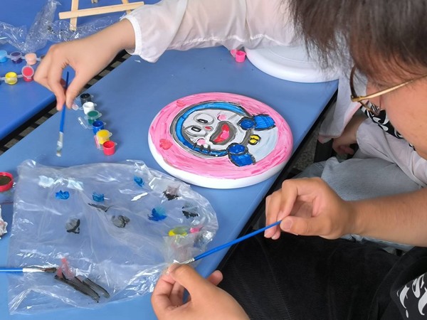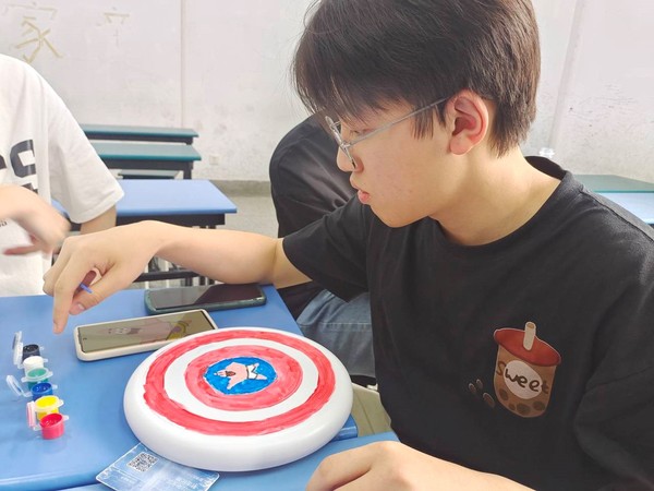 取上颜料和飞盘,各小组在教室内进行飞盘绘制,大家充分发挥创造力与想象力,将日常爱好、生活态度、未来憧憬等融入其中,蕴意丰富,活动现场笑声一片。