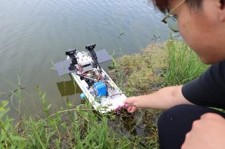 为验证“稻鸭共作”方式的可行性,小分队来到东南村的水稻田边,利用自主研发的测量船分别对普通稻田和鸭间稻田的水质进行检测,得到不同空间水质的相关数据。小分队将测量得出的数据与标准数据进行对比,从而成功验证了“稻鸭共作”方式是切实可行的生态农业环保方案。