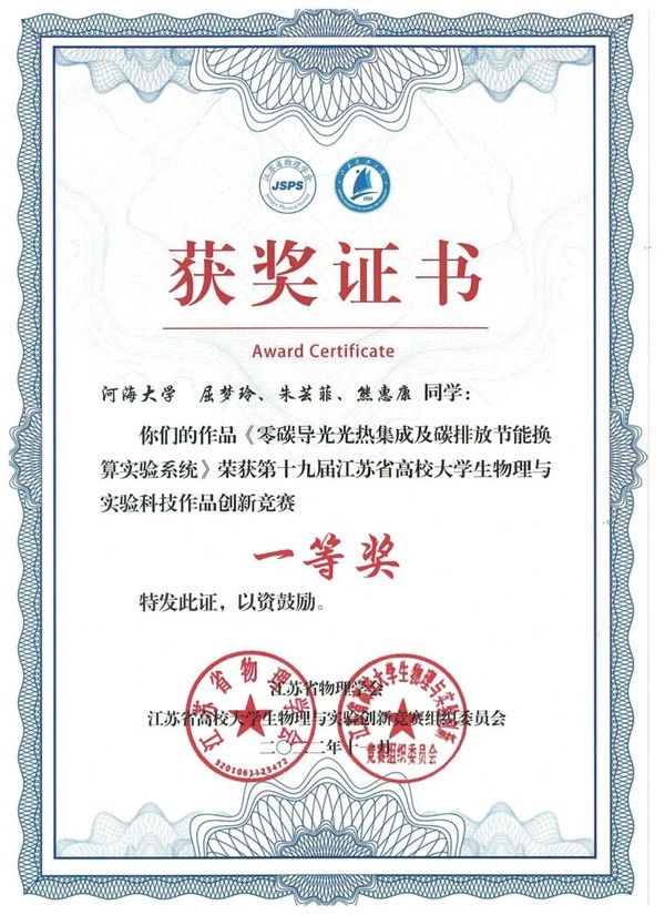 第十九届江苏省高校大学生物理与实验科技作品创新竞赛一等奖,省级
