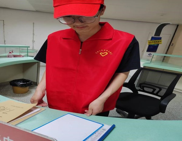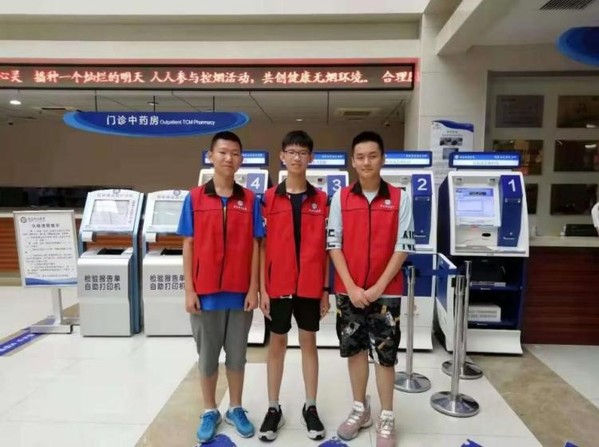 成员在烟台市医院与同学一起担任志愿者