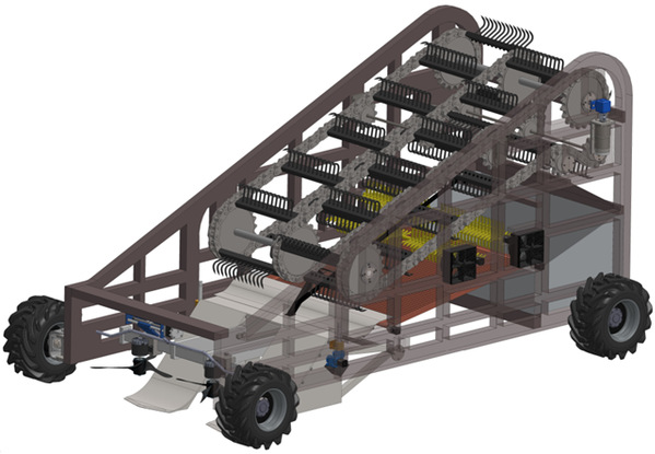 《智能化芋头收获机》是一款创新芋头传输方式,巧妙布置链轮位置以实现叶果分离的收获机,能够同时高效收获双垄芋头,保证芋头果实的完果率,减少时间与人力成本。自2023年10月起,小组在指导老师的带领下,深入调研芋头种植条件,设计了此台集切叶、挖掘、输送、摘果、清选和集箱等功能于一体的芋头收获机。他们齐心协力,共同设计三维模型,确定组成部件、完成模型答辩、制作说明书及相关视频,前往杭州电子科技大学现场进行决赛答辩评审,最终荣获佳绩。