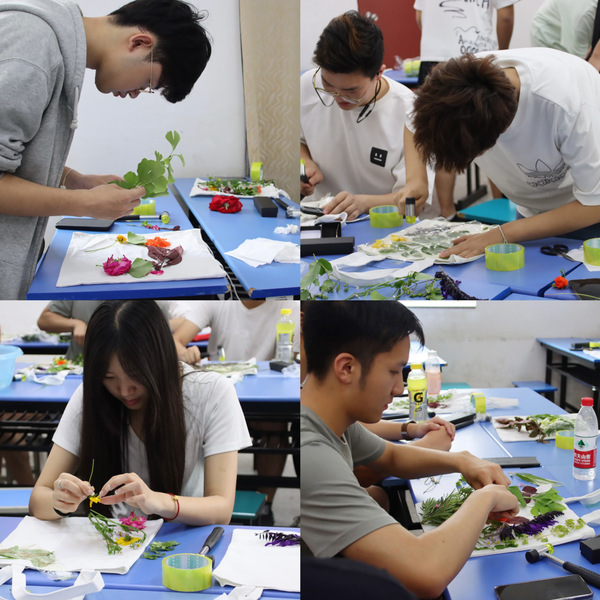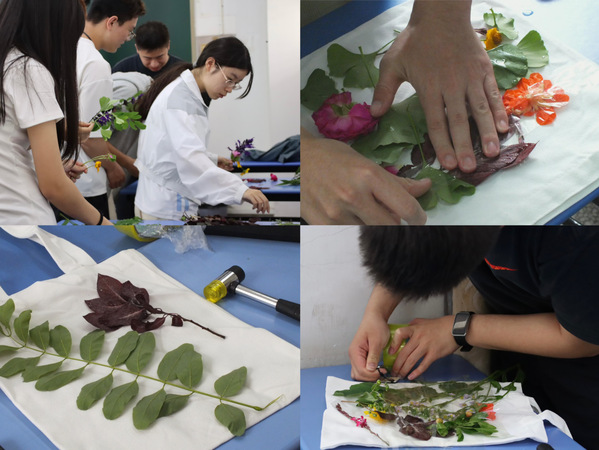 接着,通过观看视频,同学们了解了植物拓染的全过程。在所有材料准备就绪后,大家跃跃欲试。拓染体验过程中,大家挑选心仪的花草,摆出满意的图案;挥动金属的小锤,留下春天的纹理;托举精致的成品,留下满室的欢笑。同学们不仅学会了如何制作拓染作品,更重要的是学会了如何用心感受生活中的每一个瞬间。