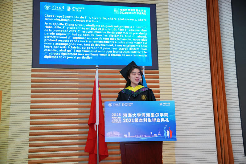 2021级机械工程专业张启雯同学代表全体毕业生发言,她表示,将以母校为起点,胸怀“国之大者”,立志“长风破浪”,在奋斗与攀登中尽展河海里尔学子的赤诚与担当。