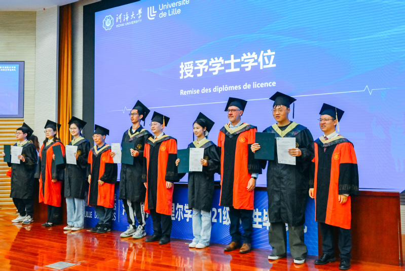 学位授予仪式上,校院领导亲手为毕业生拨正流苏、颁发证书,并合影留念。庄严的仪式既是对学子们四载努力的认可、未来奋进的期盼,更是百十河海精神的接力传递和深情嘱托。