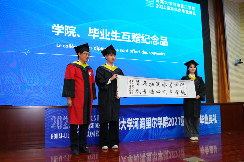 毕业生同学们以书法作品“师泽若水,润物无声;桃李争妍,四海垂风” 浓缩对母校的感恩、对师长的敬意,象征河海里尔精神的薪火相传。