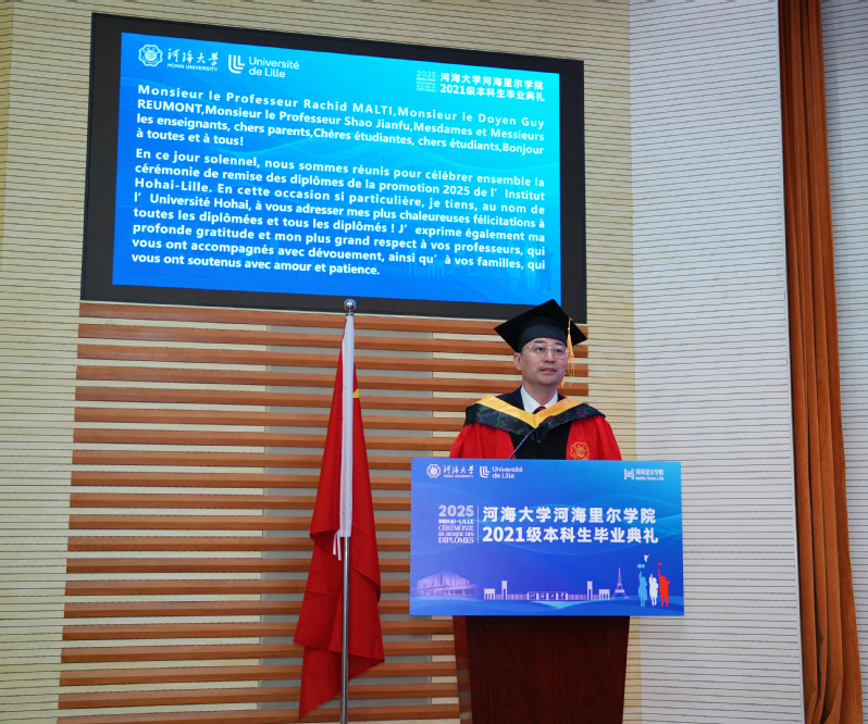 Rachid MALTI领事在致辞中充分肯定了学院在中法合作交流方面作出的重要贡献,高度赞扬了学院独特的双文化教育模式。他勉励毕业生们将在学校获得的专业知识与跨文化交流能力化为进入知名企业和高等学府的坚实基础和宝贵财富,奋发努力,期待大家成为中法友好交流与合作的坚实桥梁。