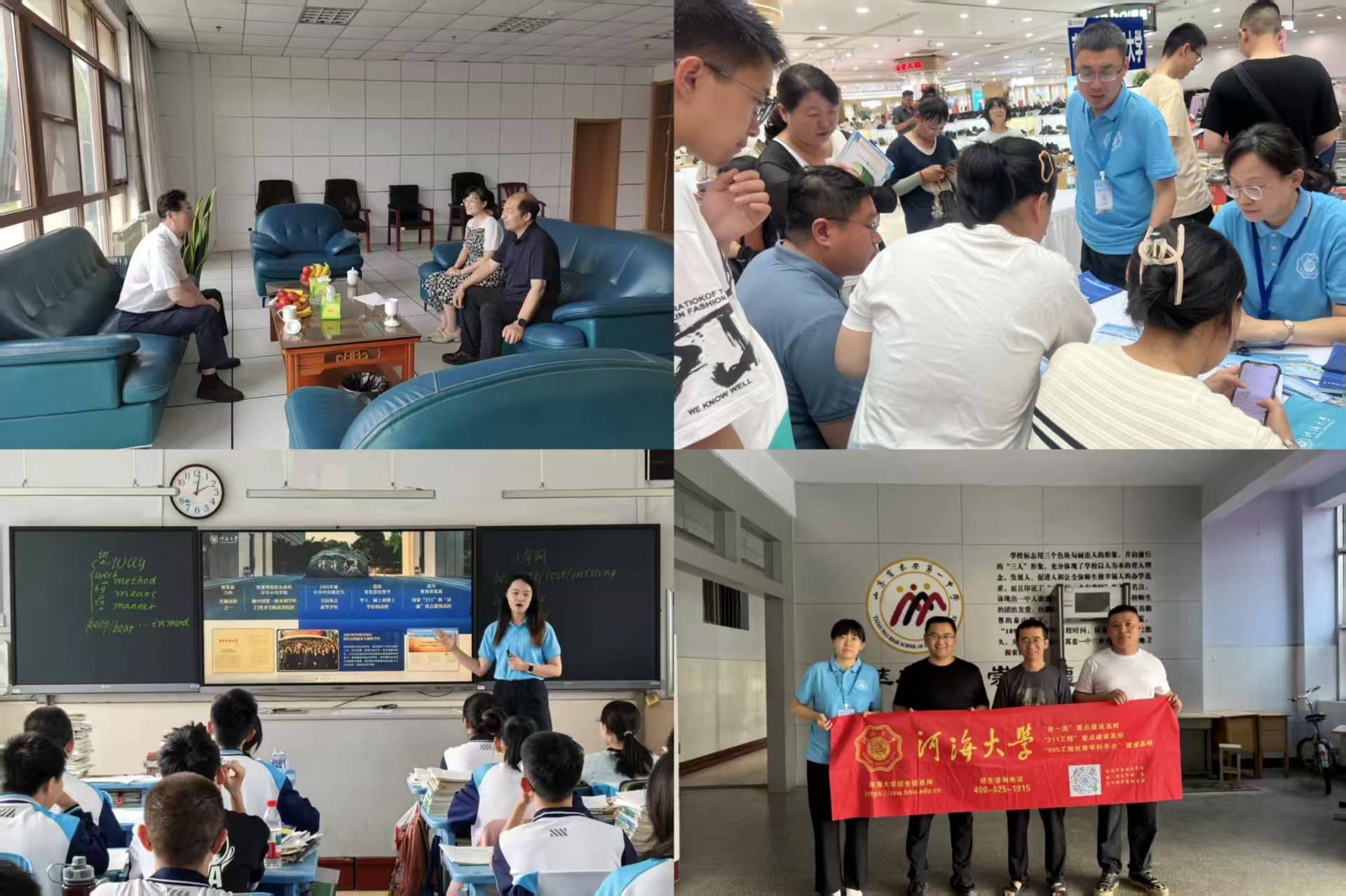 左上图:与重点中学老师交流 左下图:向高三学生宣传ok138cn太阳集团 右上图:高招会现场接待咨询 右下图:走访重点中学