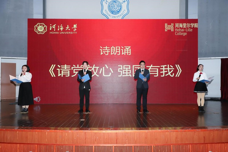 最后,2021级四位同学为大家带来了诗朗诵《请党放心 强国有我》。恰逢中国共产党建党100周年,他们代表全体河海里尔学子告白祖国,坚定信心。