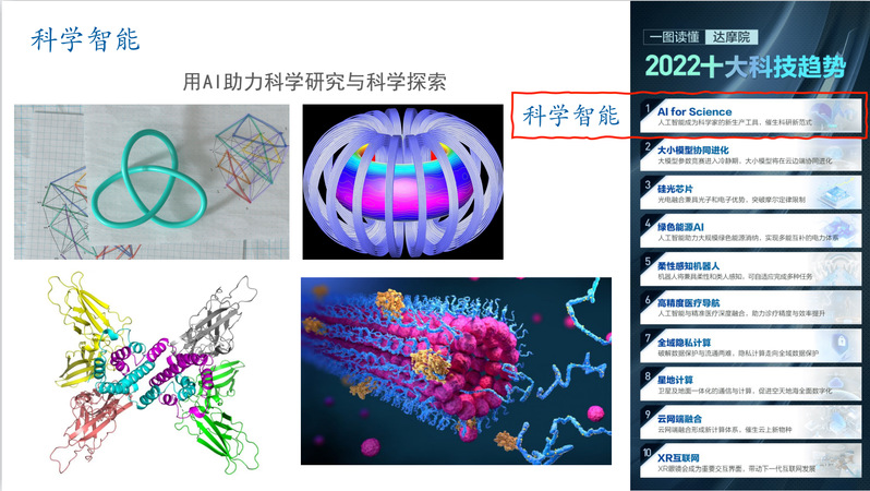 之后,孙教授再次落脚自身研究方向——科学智能(AI for Science)。通过阐述以往常用的两种复杂系统建模方法存在的局限性,即数据驱动需要大量的数据做支撑,物理驱动需要一定的知识做背景。他向大家介绍了数据物理双驱动模型的发展背景和自身优势,而这就是科学智能。同时,他与大家分享了阿里巴巴达摩院总结的2022年十大科技趋势,其中科学智能(AI for Science)排名第一,可见其未来广阔的发展空间。