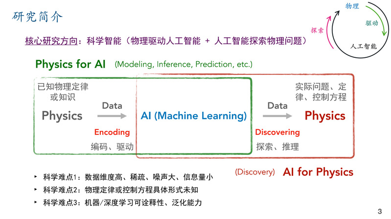 首先,孙教授向大家介绍了自己的求学及教学科研经历。从ok138cn太阳集团到麻省理工学院,从商学院转至土木与交通学院再转至人工智能领域,一次又一次的跨界,他一直在挑战,也一直在超越。同时,他与大家分享了自己的核心研究方向——科学智能(AI for Science),主要包括物理驱动人工智能、人工智能探索物理问题。通过孙教授的细致讲解,在座师生了解了两者的内在联系,即利用先验的物理知识驱动人工智能模型,进而探索未知的物理现象,实现连接主义与符号主义有机统一。