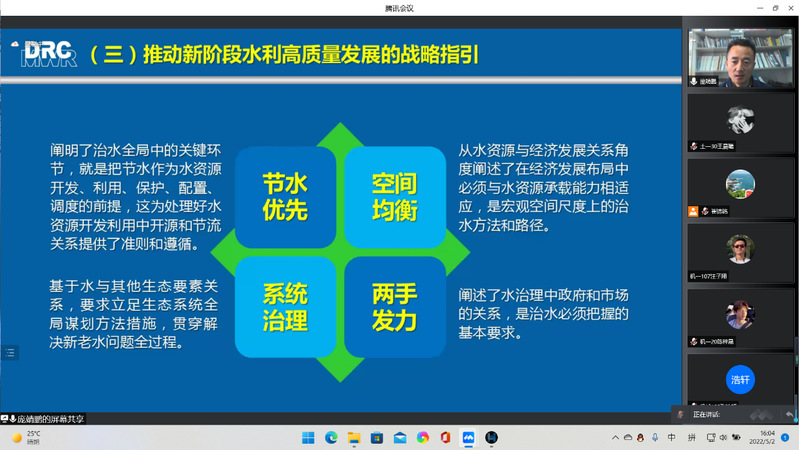 最后,庞处长通过介绍推进新阶段水利高质量发展的背景、内涵和特征,指出水利高质量发展要贯彻新发展理念,要深入践行“十六字”治水思路,坚持以人民为中心,更好地满足人民日益增长的涉水需求。到2035年,水利高质量发展取得重大进展,建成与基本实现社会主义现代化国家相适应的水安全保障体系,人民群众饮水放心、用水便捷、亲水宜居、洪旱无虞。